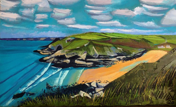 80cm x 40cm Oil on Canvas not for sale his is a view across the headland to Aberieddy, looking along the coast to st Davids head in the distance.